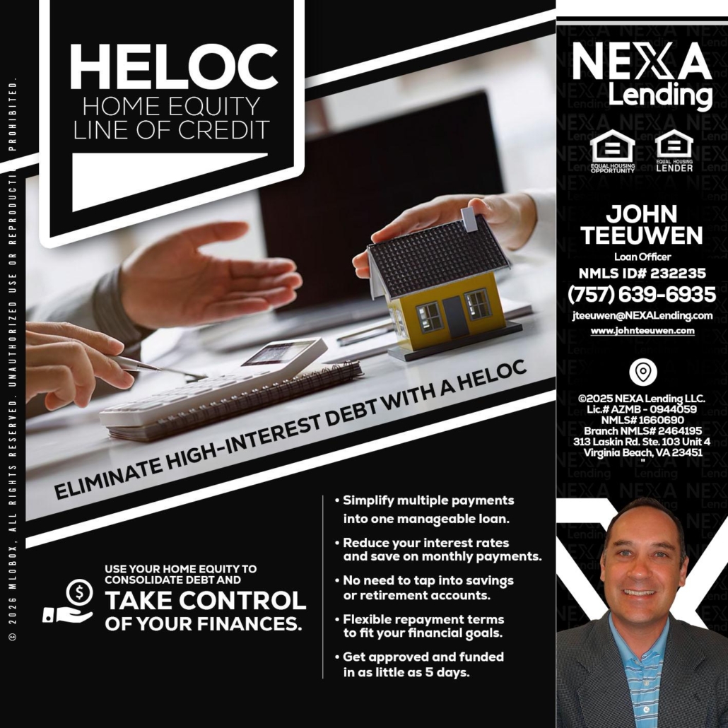HELOC - John Teeuwen -Loan OfficerHi, my name is John Teeuwen. I’m a Loan Officer with NEXA Lending LLC., offering personalized mortgage solutions, fast customized quotes, great rates and service with integrity.