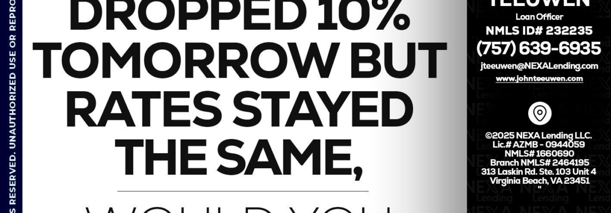 Hi, my name is John Teeuwen. I’m a Loan Officer with NEXA Mortgage LLC., offering personalized mortgage solutions, fast customized quotes, great rates and service with integrity.