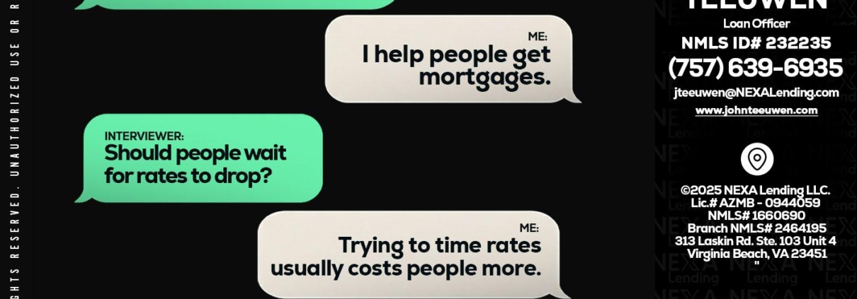 Hi, my name is John Teeuwen. I’m a Loan Officer with NEXA Lending LLC., offering personalized mortgage solutions, fast customized quotes, great rates and service with integrity.