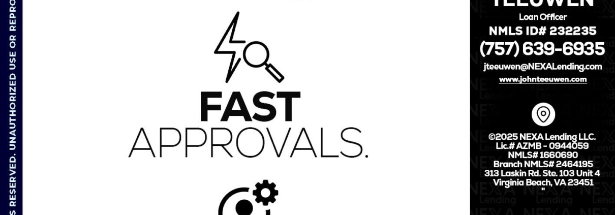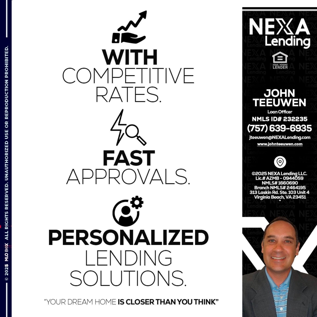 Hi, my name is John Teeuwen. I’m a Loan Officer with NEXA Mortgage LLC., offering personalized mortgage solutions, fast customized quotes, great rates and service with integrity.